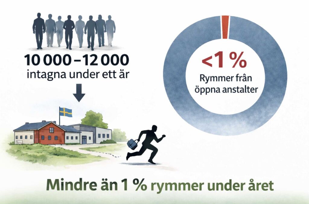 Noll rymningar direkt från anstalter, säkerhetsklass 1 och 2, dvs anstalter med murar och stängsel, senaste fem åren (2020-2024). 82 direkta avvikelser från öppna anstalter klass 3 utan stängsel. Antalet avvikelser har inte ökat senaste fem åren.10.000-12.000 personer tas in i fängelse under ett år mellan 0,8 och 0,6 procent rymmer/avviker och då endast från öppna anstalter som saknar stängsel.